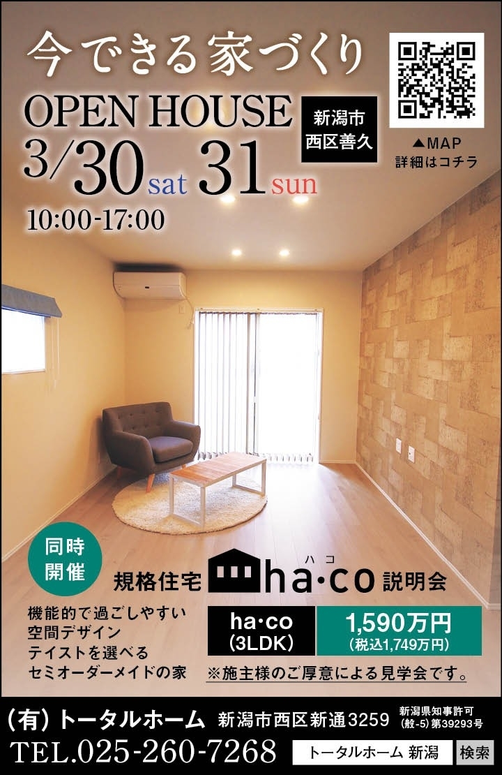 2024年03月29日(金) 見学会 【西区善久】新築住宅 完成見学会最終開催!! 新築住宅 完成見学会最終開催!! ※ご見学会場はha・coシリーズとは異なります※ OPEN 3月30日(土)・31日(日) 10:00~17:00 新潟市西区善久地内 この機会にぜひご見学ください。